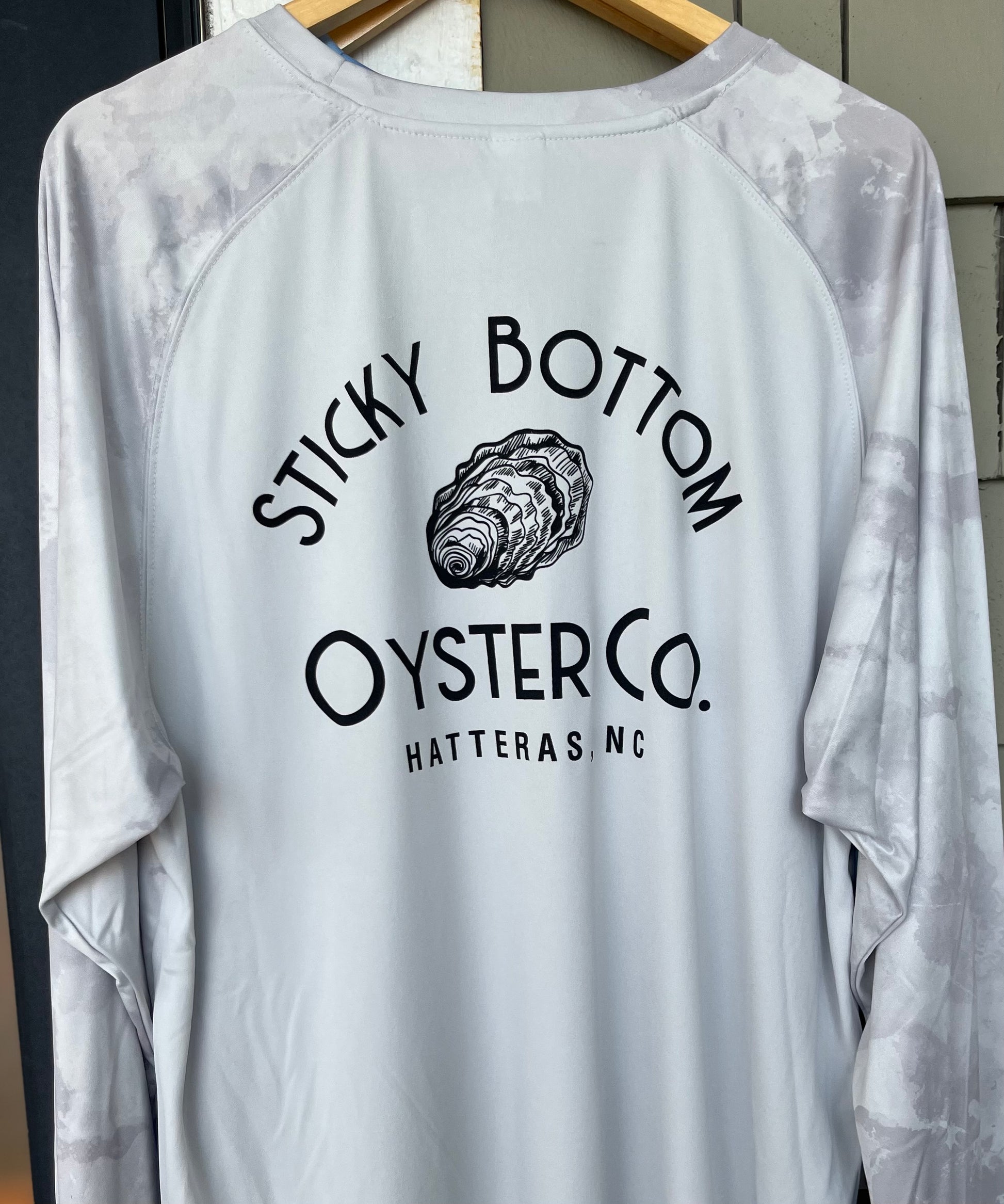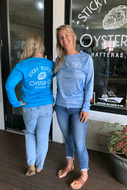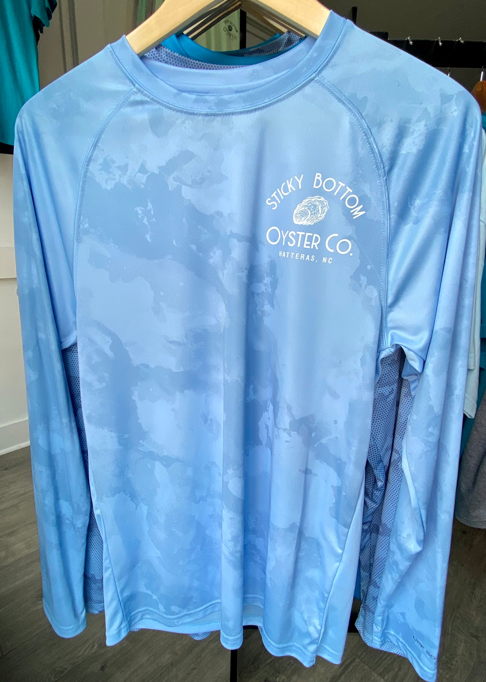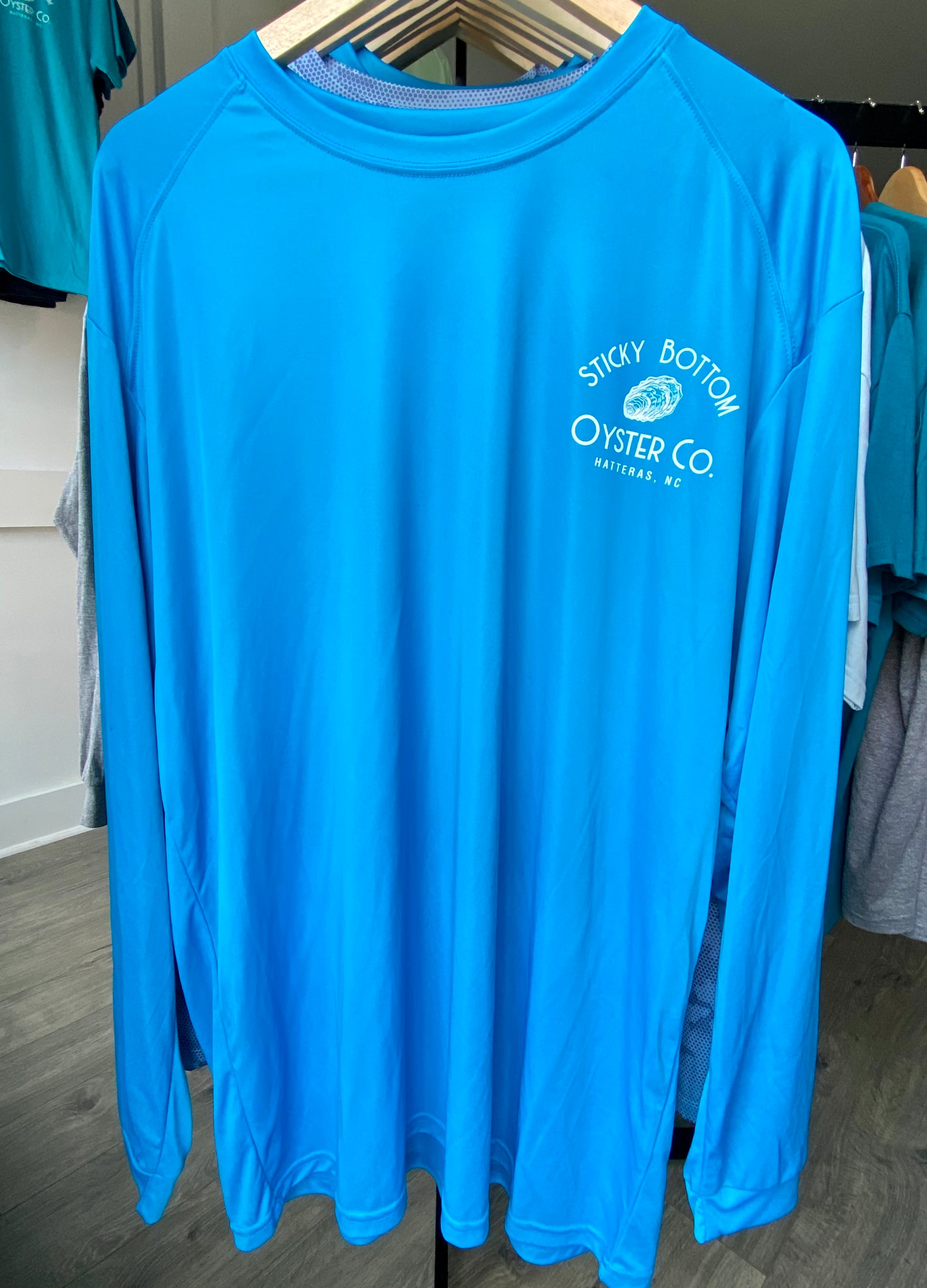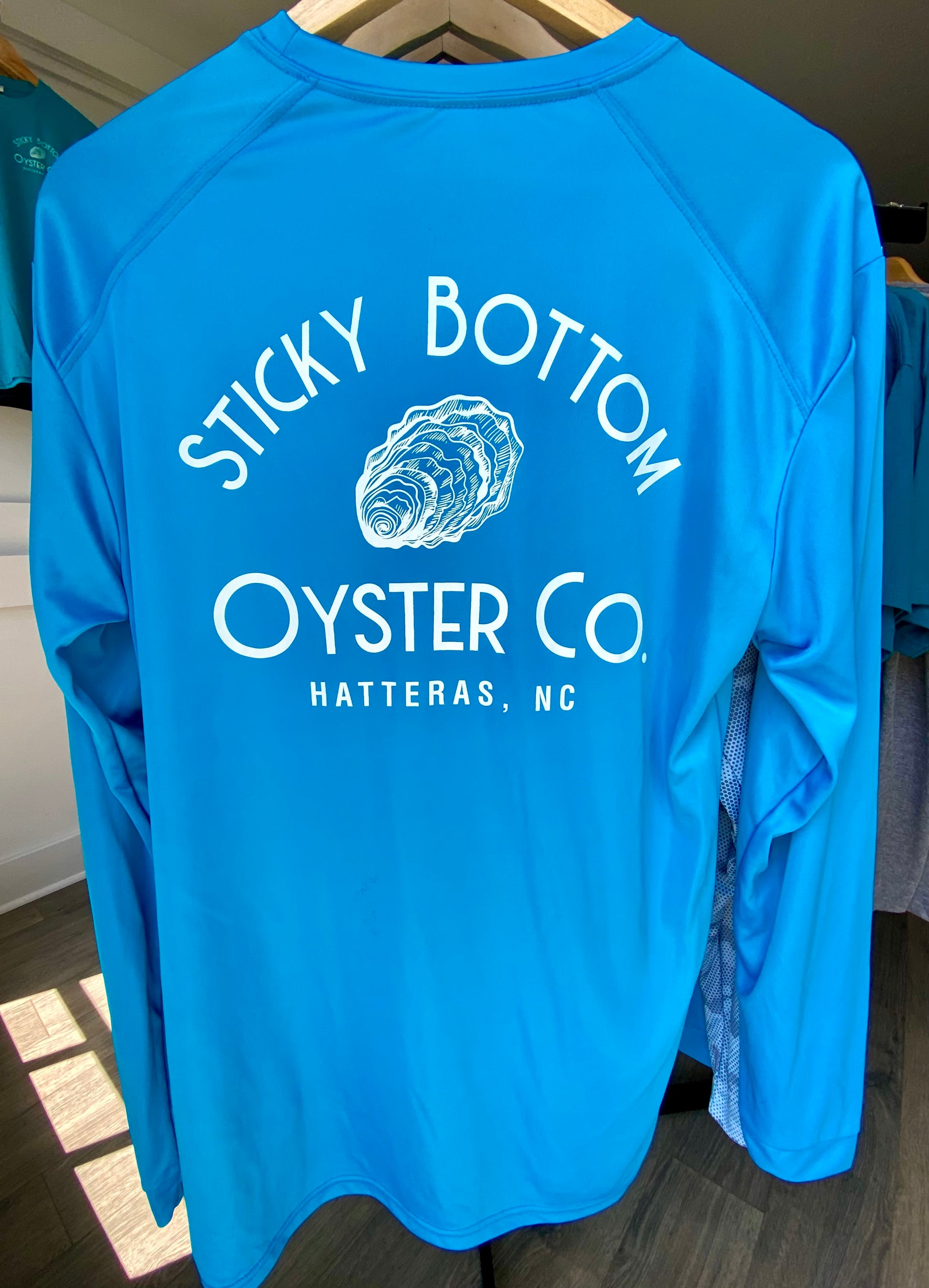 Introducing Sticky Bottom Oyster Co. logo sun shirts - lightweight, stylish, and with 50 SPF protection! These shirts come in fun beach-friendly colors, and the Big Logo is featured on the back while a small logo sits on the left front. They're the ultimate combination of fashion and functionality - perfect for beach lovers.